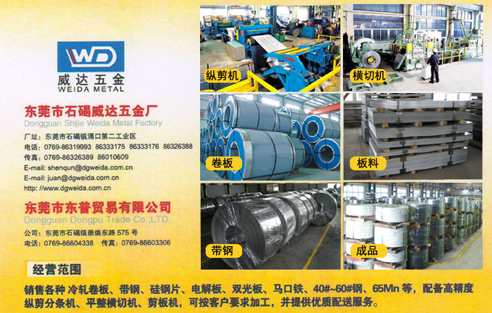 經(jīng)營范圍:銷售各種冷軋卷板、帶鋼、硅鋼片、電解板、雙光板、馬口鐵、40-60#鋼、65Mn等,配備高精度縱剪分條機(jī)、平整橫切機(jī)、剪板機(jī)、可按客戶要求加工,并提供優(yōu)質(zhì)配送服務(wù)。